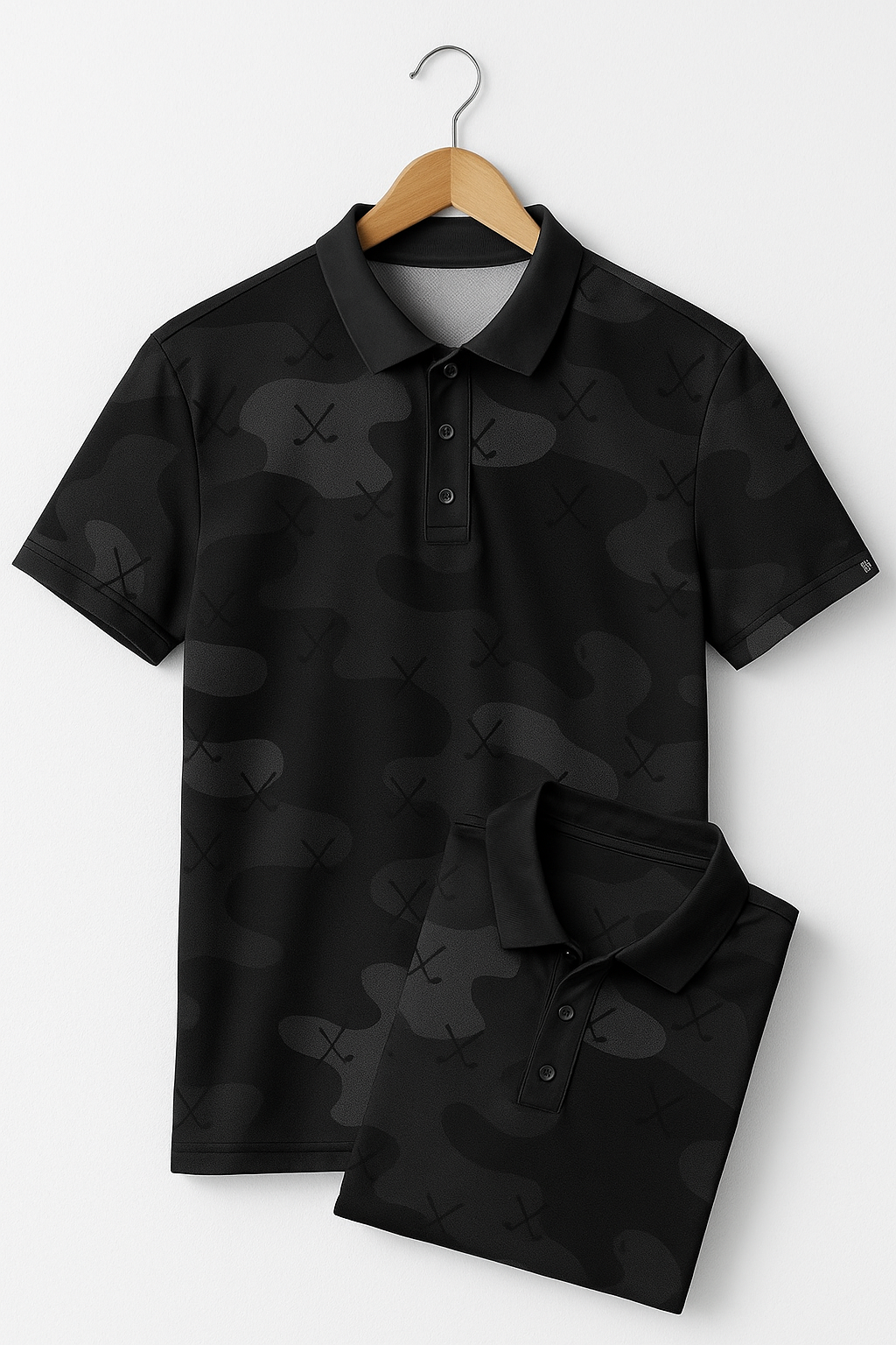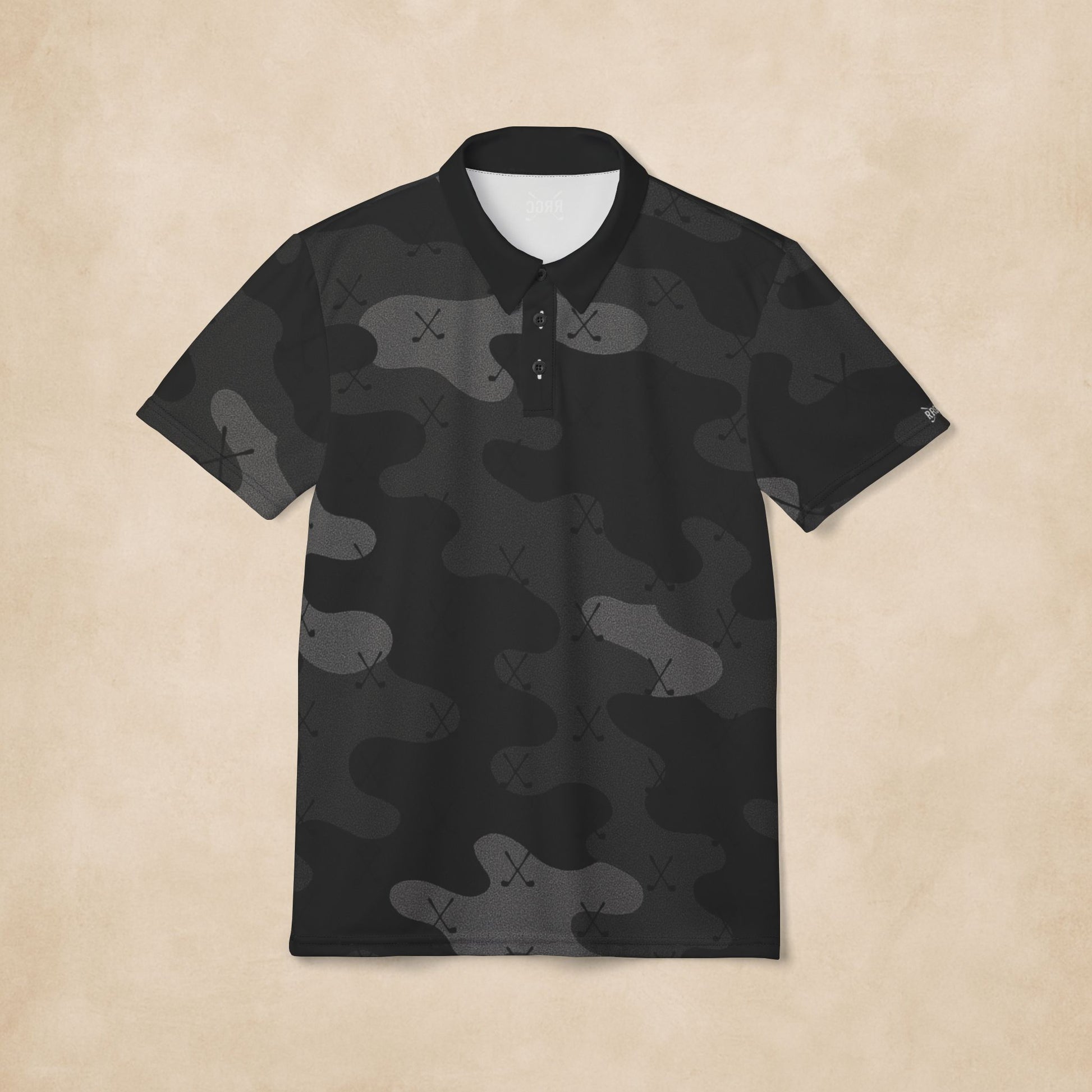 Elevate your game with the RRGC Black Camo Polo — where performance meets subtle statement. This premium polo features a sleek black and gray camouflage pattern, detailed with crossed golf clubs woven seamlessly throughout the design.